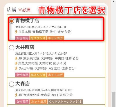 品川区にある店舗が一覧で表示されるので、【青物横丁店】を選択。